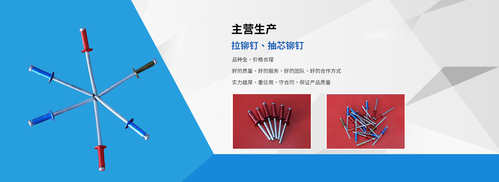 臨沂市龍牌異型鉚釘廠是拉鉚釘、抽芯鉚釘等產(chǎn)品生產(chǎn)加工的個體經(jīng)營,公司總部設(shè)在臨沂市羅莊區(qū),臨沂市龍牌異型鉚釘廠具有完整、科學的質(zhì)量管理體,公司自成立以來,一直秉承“質(zhì)量為準,客戶至上”的經(jīng)營理念,以產(chǎn)品“品種豐富、價格合理”,在消費者當中享有較高的身分,得到了廣大消費者的信賴與好平,公司并與多家零售商和代理商建立了長期穩(wěn)定的合作關(guān)系,公司實力雄厚,重信用、守合同、產(chǎn)品質(zhì)量放心,以多品種經(jīng)營特色和薄利多銷的原則,歡迎廣大消費者前來洽談業(yè)務!
